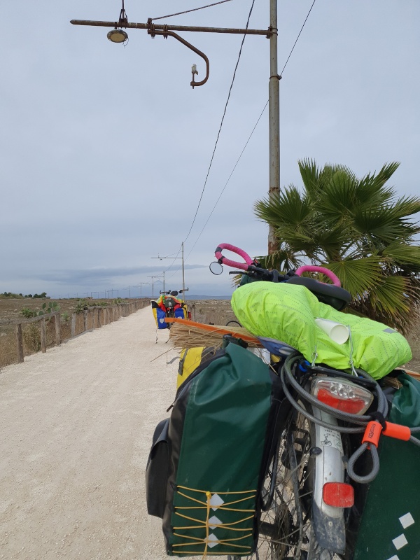 Nous repartons tranquillement de Syracuse, le long de la côte en direction du nord. Ça commence bien, on a droit à quelques kilomètres sur une voie cyclable (la première de Sicile), et même à la vue sur l’Etna !