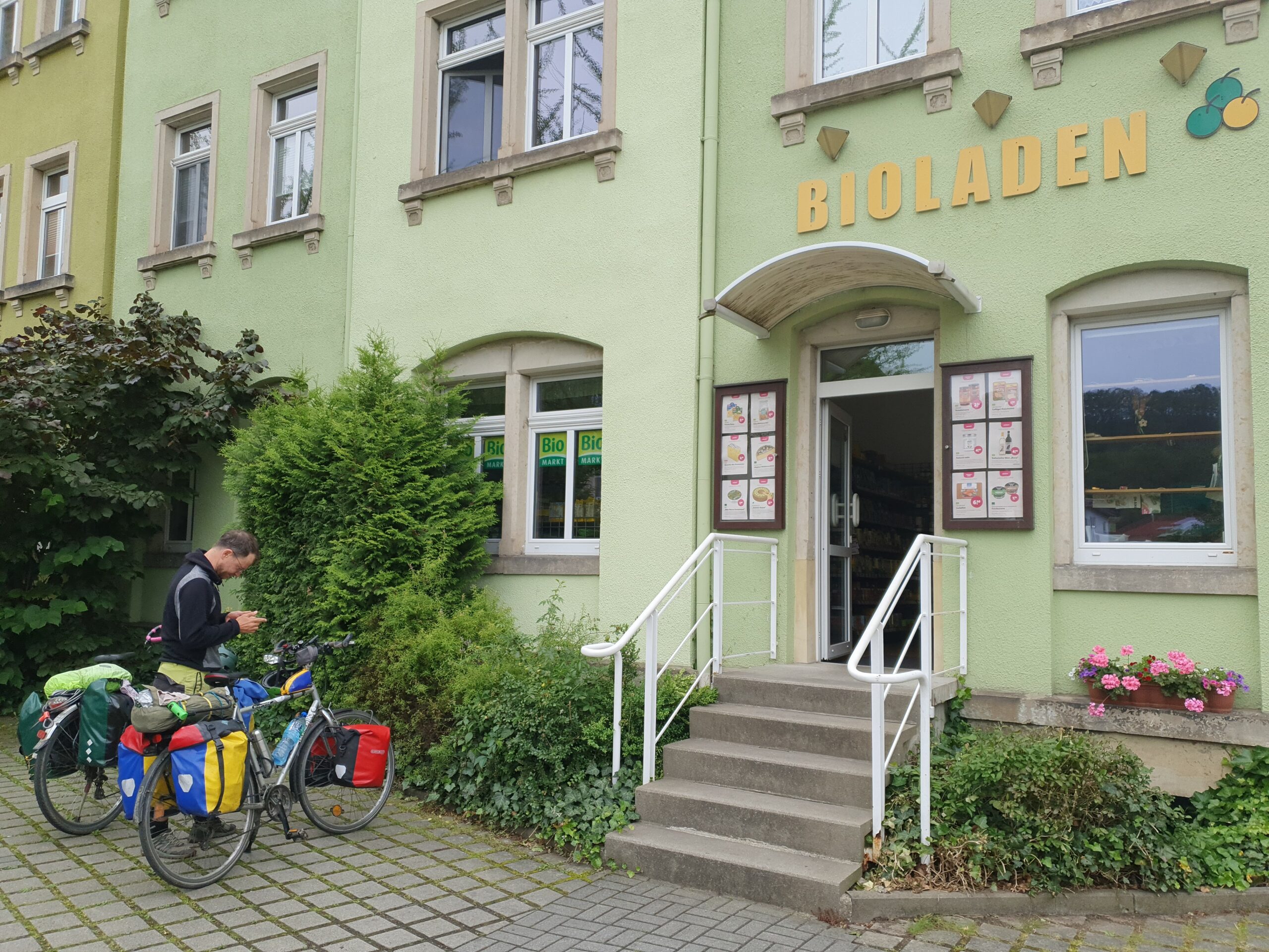 Tatiana ist froh, dass sie wieder einen kleinen Bioladen und eine super gute Bäckerei gefunden hat, um die Satteltaschen zu füllen. Der Euro-Radweg nach Dresden ist fast eine „Fahrradautobahn“: Es gibt sooo viele Radfahrer:innen.