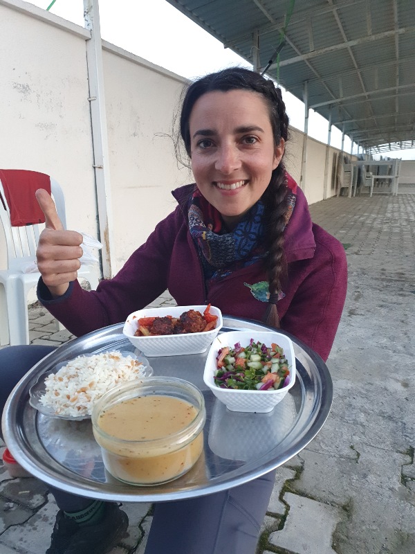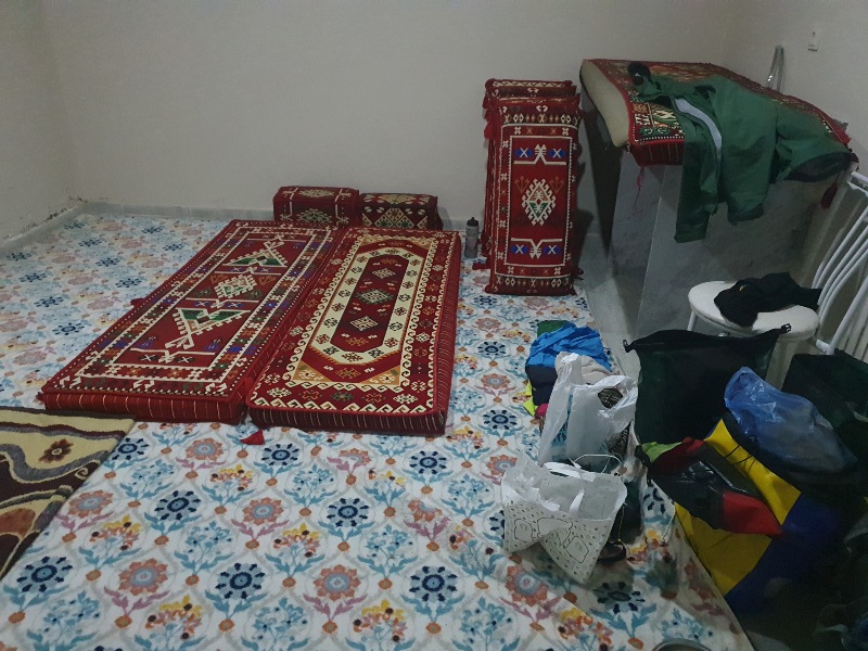 Am nächsten Tag bietet uns ein Herr an, in szine aktuell geschlossenen Hochzeitslocation zu übernachten, genauer gesagt im Gebetsraum der Frauen: Gemütliche Atmosphäre auf den großen Teppichen und bunten Futons. Kurdische Nachbar:inne:n bringen uns ungefragt ein vielseitiges Abendessen auf einem Tablett! Was für eine Großzügigkeit!