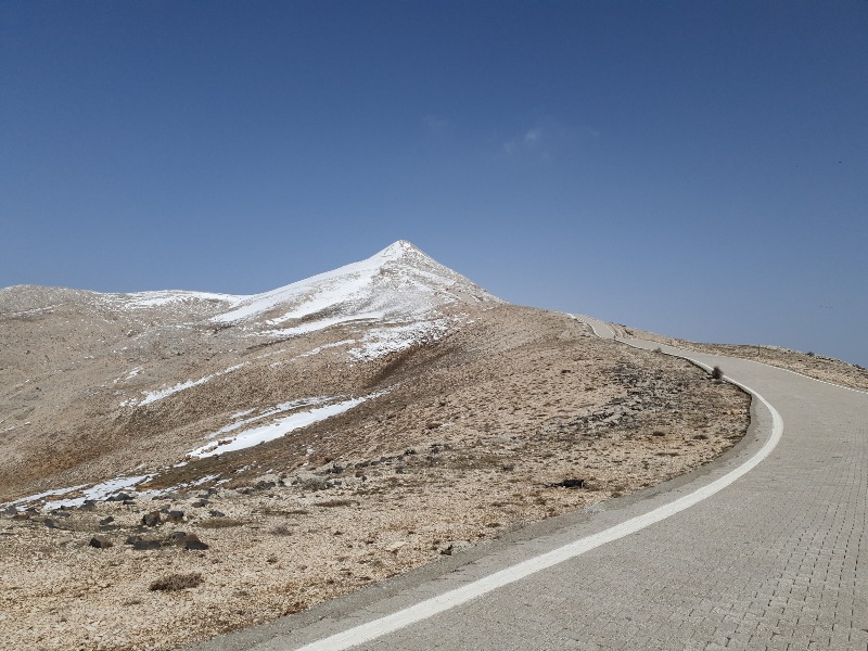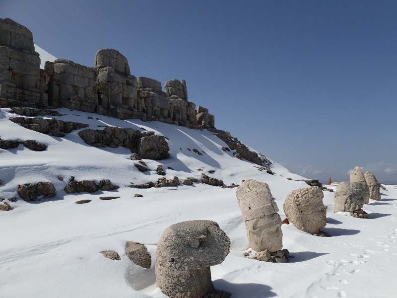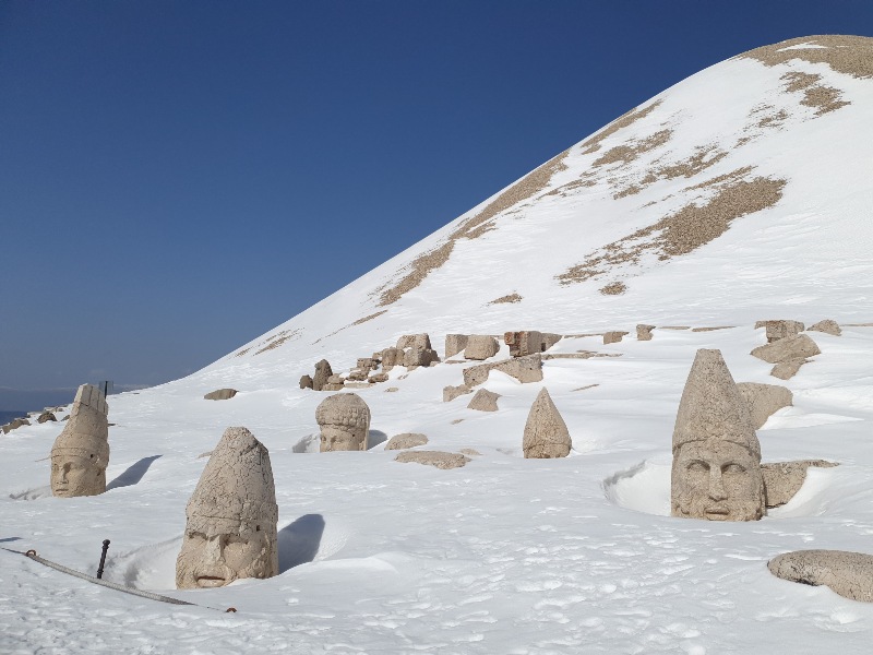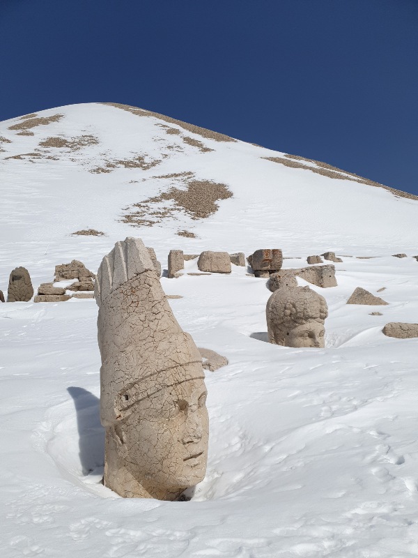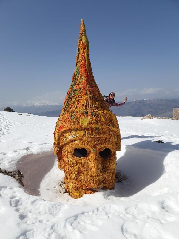 Nach einem Tag per Anhalter* (ohne Fahrräder) erreichen wir den Berg und UNESCO-Weltkulturerbe-Ort „Nemrut Dagi“ auf 2.200 m Höhe. Hier ruhen König Antiochos I. von Kommagene und vor allem die Überreste monumentaler Statuen. Eine originelle Kulisse und ein Panorama über das Euphrat-Tal, das wir mit den Füßen im Schnee betrachten können.