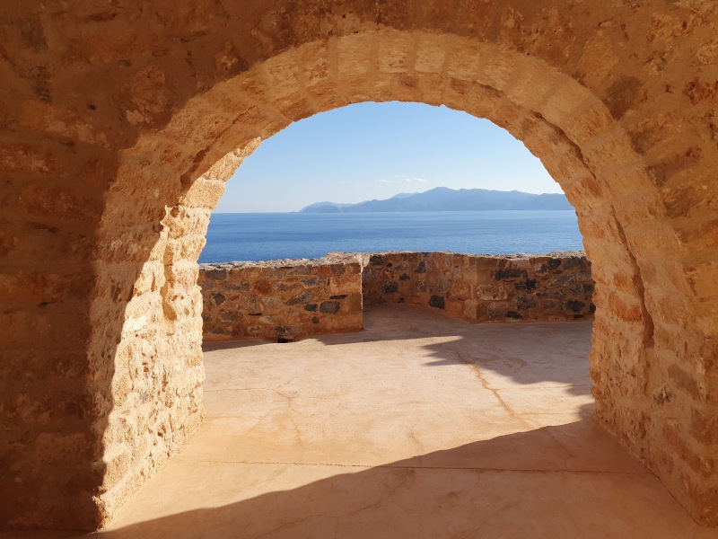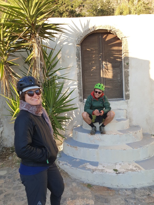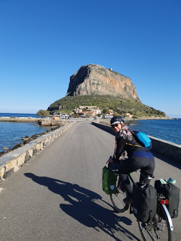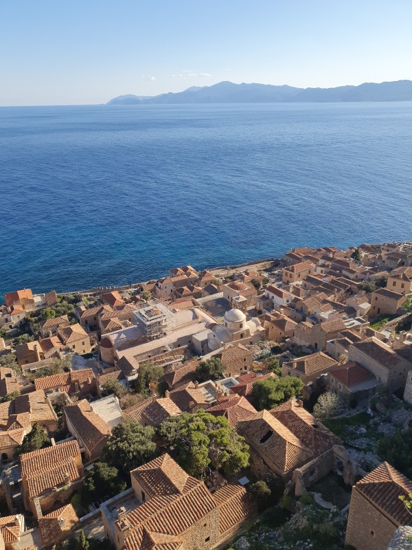 40 Kilometer weiter kommen wir nach Monemvasia: ein 300 m hoher Felsen, der überraschend aus dem Meer ragt. Wir überqueren den kleinen Damm, der zu ihm führt, besichtigen die Ruinen der Oberstadt und anschließend die touristischen Gassen der Unterstadt. Am Abend ist der Sternenhimmel wunderschön. In dieser Nacht ist unsere Unterkunft ungewöhnlich: eine niedliche kleine orthodoxe Kapelle.
