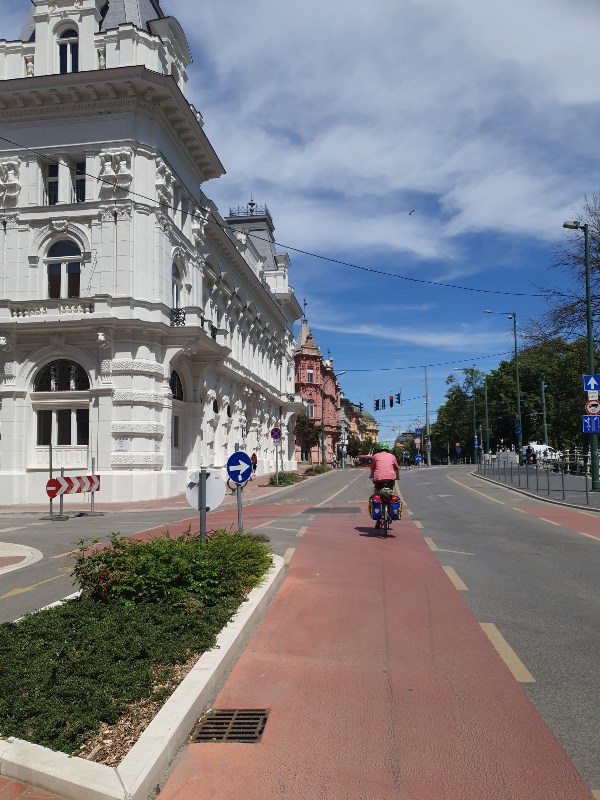 C’est au premier village après la frontière hongroise qu’un homme nous fait signe de nous asseoir dans un café et nous paie l’apéro. Sympa ! Nous arrivons ensuite à Szeged, 3ème ville du pays, où nous attend János, notre hôte du réseau Warmshowers.
