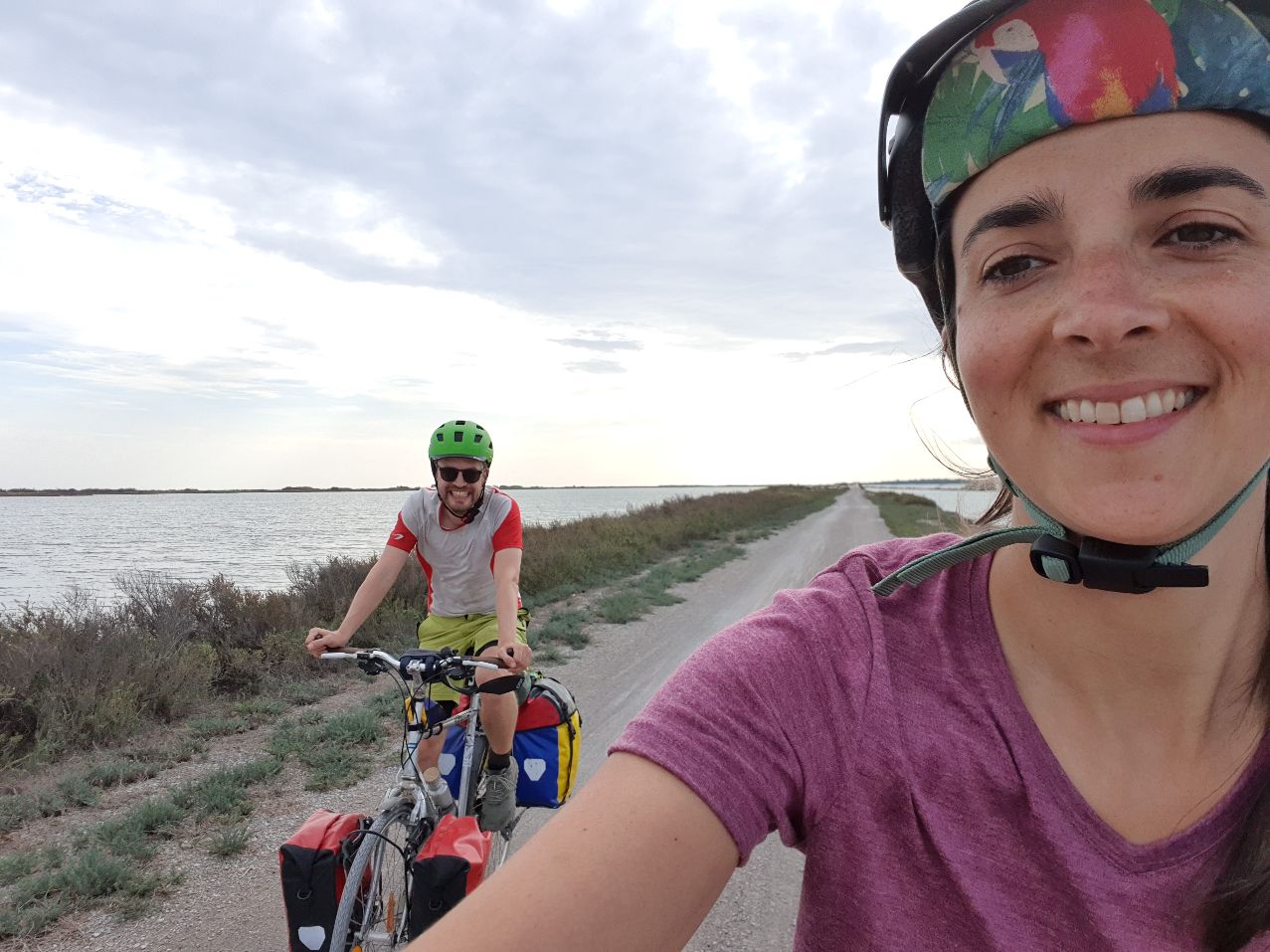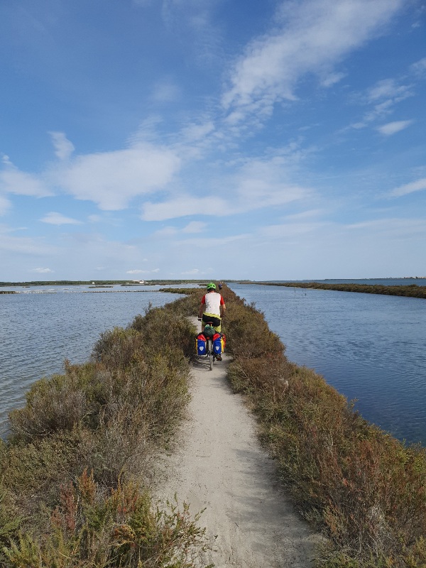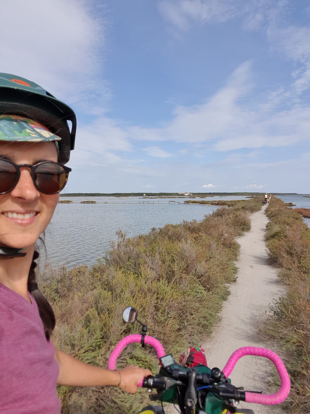 En partant de Sète, le trajet nous fait passer par des sentiers entre les marais salants. C’est magnifique !