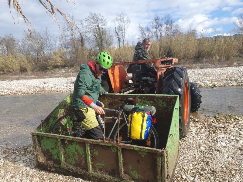 Le lendemain, la carte nous mène sur un chemin… Qui traverse une rivière. Un agriculteur qui passe pile Ă ce moment nous facilite la traversĂ©e en nous prenant dans son tracteur. Sympa !