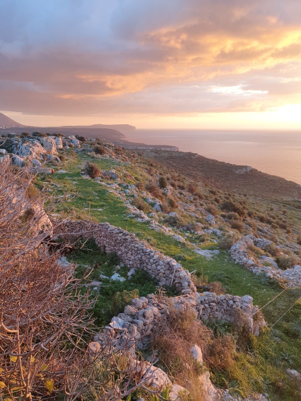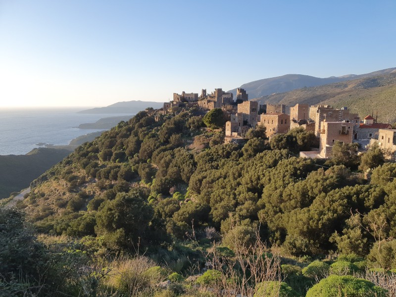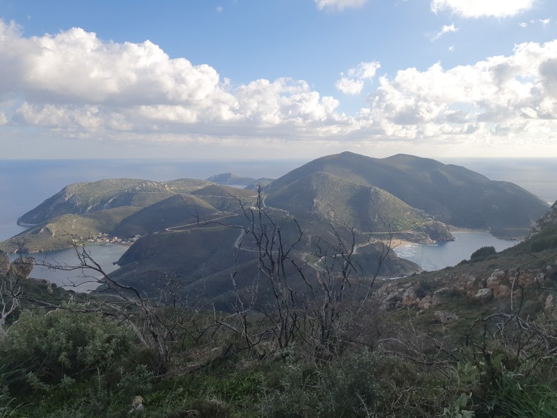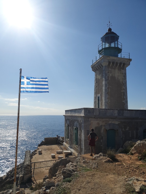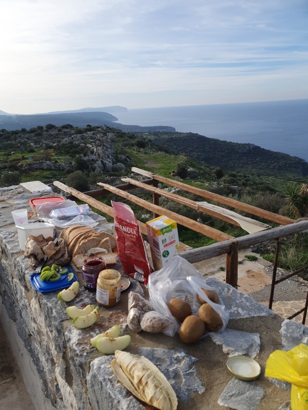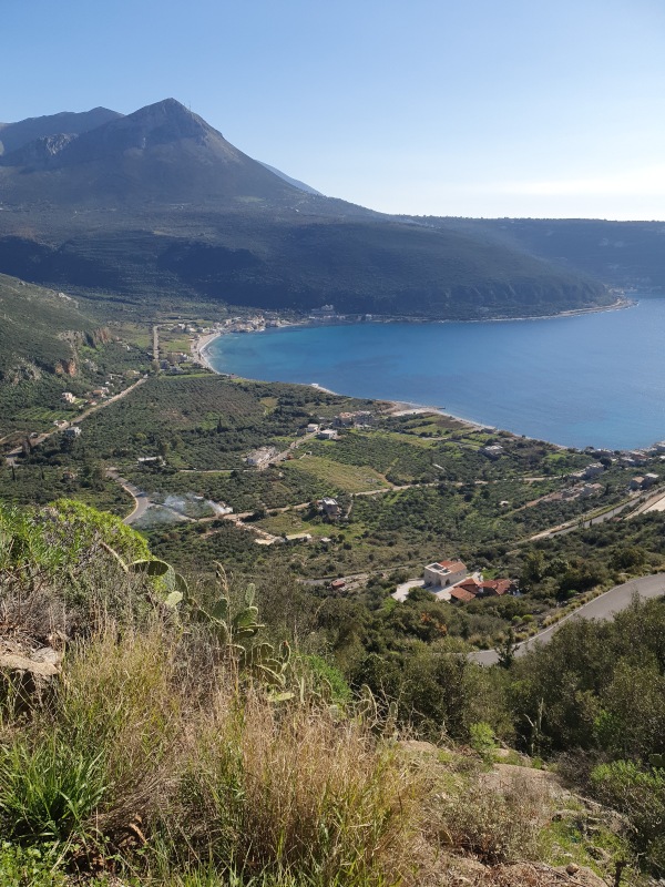On commence par une montée de 500m en pente douce, suivie d’une magnifique descente en lacets au-dessus de la mer. Nous passons 2 nuits chez Stephan, un germano-belge, mais grec d’adoption qui prête sa maisonnette de location aux voyageurs et voyageuses. Il est déçu de l’évolution du village, Stoupa, devenu un lieu pour touristes riches : preuve en est avec les transats de plage qui se louent à 100€ la journée.