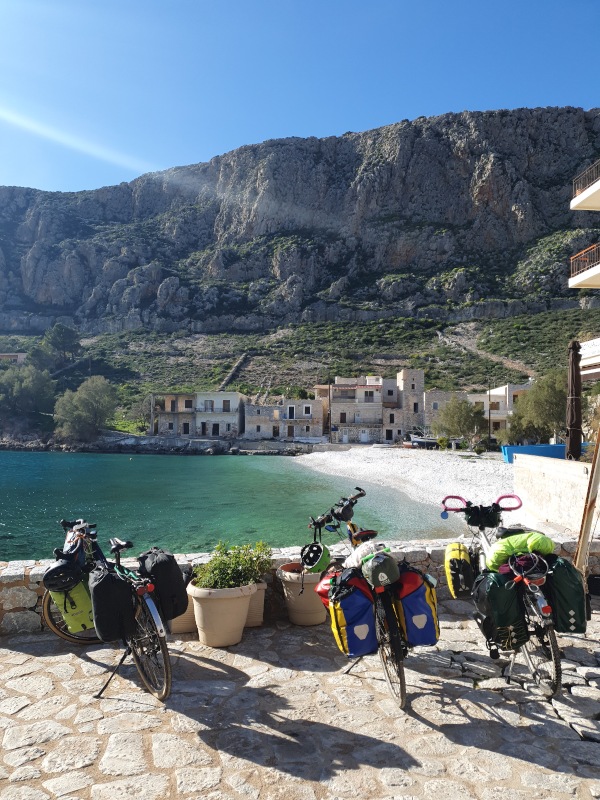 Le 22 janvier, nous avons rendez-vous avec Nadja, une cyclovoyageuse suisse que nous avons croisée sur la route, et avec qui nous allons cheminer les prochains jours. C’est parti pour Mani (« le Magne » en français), la péninsule centrale du Péloponnèse.