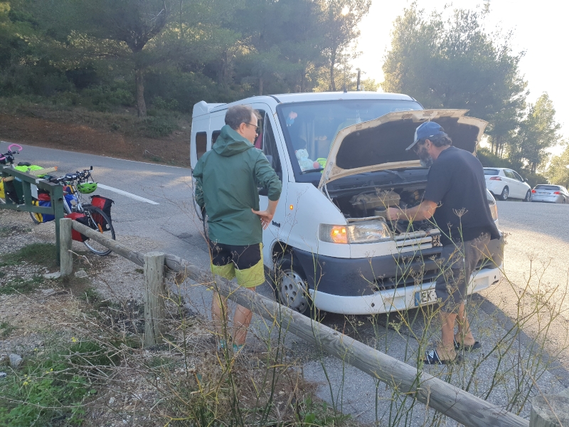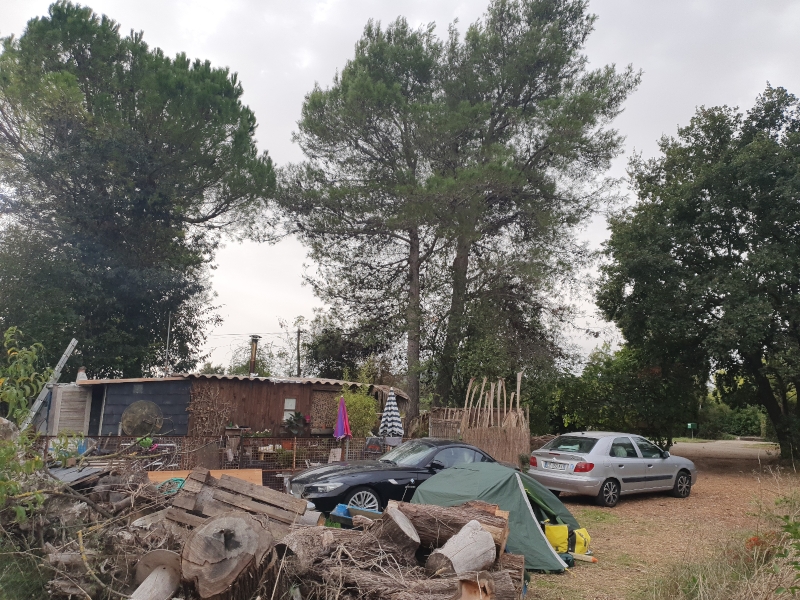 La soirée nous fera drastiquement changer de décor. Alors que nous avons du mal à trouver un lieu où planter la tente dans la banlieue verte de Toulon, nous demandons conseil à un monsieur qui promène son chien. Il nous conduit à un terrain dont il est propriétaire, divisé en petites parcelles sur lequelles sont installées des maisonnettes de fortune qu’il loue. En voyant le lieu et l’ambiance, nous ne sommes pas très à l’aise, mais ne nous sentons pas en danger non plus alors on reste.