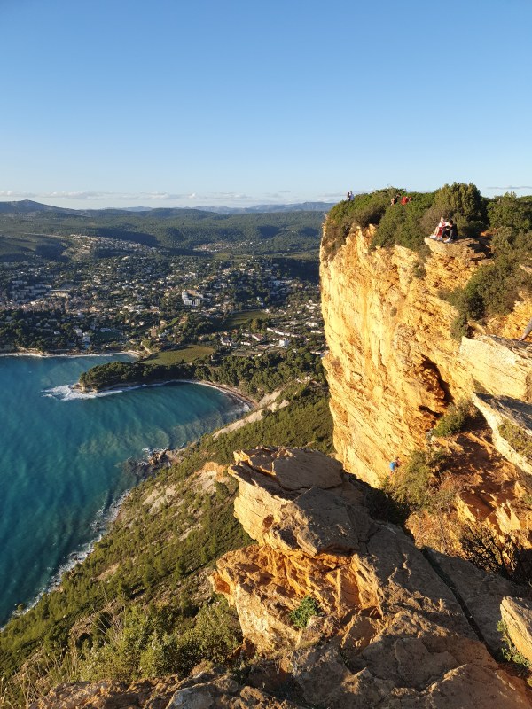 Nous admirons la vue sur la Méditerranée et ses falaises, à côté de nombreux badauds et d’un couple de mariés avec leur photographe. La lumière du soleil qui commence à baisser est effectivement particulière…