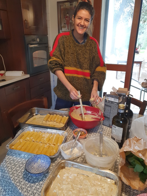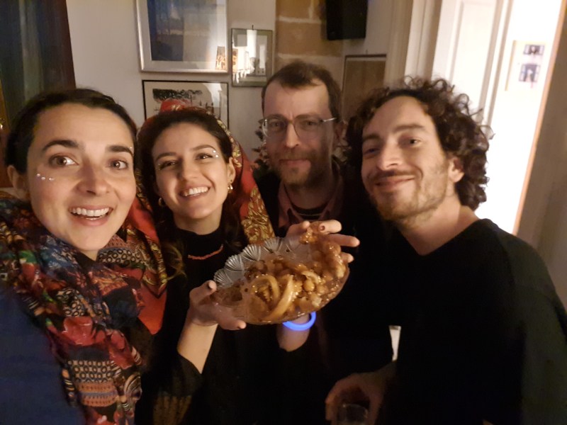 Le 31, c’est la préparation des lasagnes et cannelloni à la pistache pour le Capodanno (réveillon). Julian confectionne une Kartoffelsalat et Tatiana des gâteaux. Petit à petit, les invités arrivent et le buffet prend de l’ampleur. Ce sera une jolie fête intergénérationnelle, avec de la danse dans le salon, des discussions dans la cuisine et des chants italiens à la guitare autour du feu dans le jardin. La coutume veut que chacun-e porte un vêtement rouge et neuf : Ernesto et Greta nous offrent une paire de chaussettes à motifs vélo pour qu’on vive la tradition ! A minuit, tout le monde s’embrasse et se souhaite de bonnes choses.