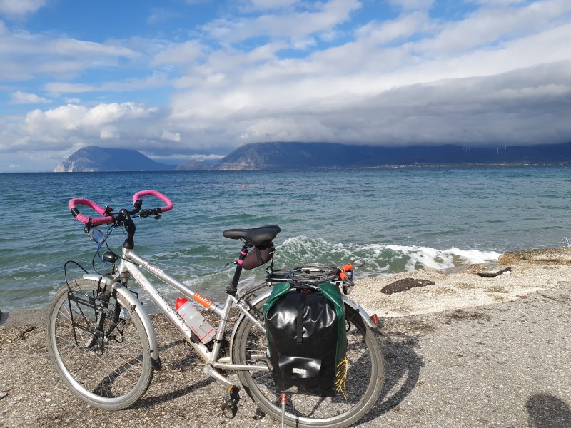 30 minutes après notre débarquement à Patras, nous arrêtons nos vélos pour regarder la carte. Une dame nous aborde en anglais pour nous proposer de l’aide… Et finalement nous invite à déjeuner chez elle ! Nous nous rendons donc chez Ioanna et sa famille, toute étonnée de voir débarquer 2 invités impromptus. Les quelques heures avec eux nous permettent d’avoir un premier aperçu de la Grèce, et de commencer ce séjour avec une sacrée bonne impression de ses habitantes et habitants.
